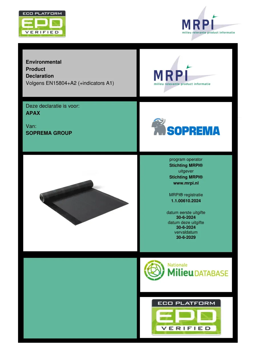 Environmental Product Declaration Volgens EN15804+A2 (+indicators A1) Deze declaratie is voor: APAX Van: SOPREMA GROUP program operator Stichting MRPI® uitgever Stichting MRPI® www.mrpi.nl MRPI® registratie 1.1.00610.2024 datum eerste uitgifte 30-6-2024 datum deze uitgifte 30-6-2024 vervaldatum 30-6-2029