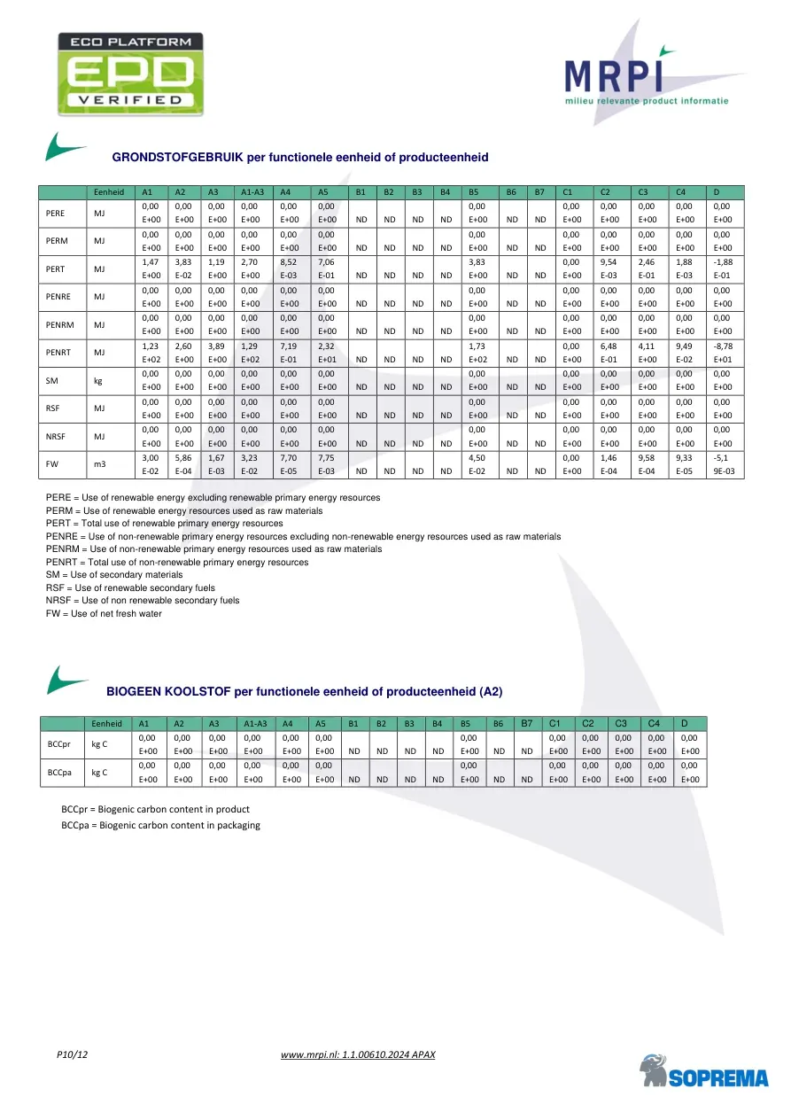 P10/12 www.mrpi.nl: 1.1.00610.2024 APAX GRONDSTOFGEBRUIK per functionele eenheid of producteenheid Eenheid A1 A2 A3 A1-A3 A4 A5 B1 B2 B3 B4 B5 B6 B7 C1 C2 C3 C4 D PERE MJ 0,00 E+00 0,00 E+00 0,00 E+00 0,00 E+00 0,00 E+00 0,00 E+00 ND ND ND ND 0,00 E+00 ND ND 0,00 E+00 0,00 E+00 0,00 E+00 0,00 E+00 0,00 E+00 PERM MJ 0,00 E+00 0,00 E+00 0,00 E+00 0,00 E+00 0,00 E+00 0,00 E+00 ND ND ND ND 0,00 E+00 ND ND 0,00 E+00 0,00 E+00 0,00 E+00 0,00 E+00 0,00 E+00 PERT MJ 1,47 E+00 3,83 E-02 1,19 E+00 2,70 E+00 8,52 E-03 7,06 E-01 ND ND ND ND 3,83 E+00 ND ND 0,00 E+00 9,54 E-03 2,46 E-01 1,88 E-03 -1,88 E-01 PENRE MJ 0,00 E+00 0,00 E+00 0,00 E+00 0,00 E+00 0,00 E+00 0,00 E+00 ND ND ND ND 0,00 E+00 ND ND 0,00 E+00 0,00 E+00 0,00 E+00 0,00 E+00 0,00 E+00 PENRM MJ 0,00 E+00 0,00 E+00 0,00 E+00 0,00 E+00 0,00 E+00 0,00 E+00 ND ND ND ND 0,00 E+00 ND ND 0,00 E+00 0,00 E+00 0,00 E+00 0,00 E+00 0,00 E+00 PENRT MJ 1,23 E+02 2,60 E+00 3,89 E+00 1,29 E+02 7,19 E-01 2,32 E+01 ND ND ND ND 1,73 E+02 ND ND 0,00 E+00 6,48 E-01 4,11 E+00 9,49 E-02 -8,78 E+01 SM kg 0,00 E+00 0,00 E+00 0,00 E+00 0,00 E+00 0,00 E+00 0,00 E+00 ND ND ND ND 0,00 E+00 ND ND 0,00 E+00 0,00 E+00 0,00 E+00 0,00 E+00 0,00 E+00 RSF MJ 0,00 E+00 0,00 E+00 0,00 E+00 0,00 E+00 0,00 E+00 0,00 E+00 ND ND ND ND 0,00 E+00 ND ND 0,00 E+00 0,00 E+00 0,00 E+00 0,00 E+00 0,00 E+00 NRSF MJ 0,00 E+00 0,00 E+00 0,00 E+00 0,00 E+00 0,00 E+00 0,00 E+00 ND ND ND ND 0,00 E+00 ND ND 0,00 E+00 0,00 E+00 0,00 E+00 0,00 E+00 0,00 E+00 FW m3 3,00 E-02 5,86 E-04 1,67 E-03 3,23 E-02 7,70 E-05 7,75 E-03 ND ND ND ND 4,50 E-02 ND ND 0,00 E+00 1,46 E-04 9,58 E-04 9,33 E-05 -5,1 9E-03 PERE = Use of renewable energy excluding renewable primary energy resources PERM = Use of renewable energy resources used as raw materials PERT = Total use of renewable primary energy resources PENRE = Use of non-renewable primary energy resources excluding non-renewable energy resources used as raw materials PENRM = Use of non-renewable primary energy resources used as raw materials PENRT = Total use of non-renewable primary energy resources SM = Use of secondary materials RSF = Use of renewable secondary fuels NRSF = Use of non renewable secondary fuels FW = Use of net fresh water BIOGEEN KOOLSTOF per functionele eenheid of producteenheid (A2) Eenheid A1 A2 A3 A1-A3 A4 A5 B1 B2 B3 B4 B5 B6 B7 C1 C2 C3 C4 D BCCpr kg C 0,00 E+00 0,00 E+00 0,00 E+00 0,00 E+00 0,00 E+00 0,00 E+00 ND ND ND ND 0,00 E+00 ND ND 0,00 E+00 0,00 E+00 0,00 E+00 0,00 E+00 0,00 E+00 BCCpa kg C 0,00 E+00 0,00 E+00 0,00 E+00 0,00 E+00 0,00 E+00 0,00 E+00 ND ND ND ND 0,00 E+00 ND ND 0,00 E+00 0,00 E+00 0,00 E+00 0,00 E+00 0,00 E+00 BCCpr = Biogenic carbon content in product BCCpa = Biogenic carbon content in packaging