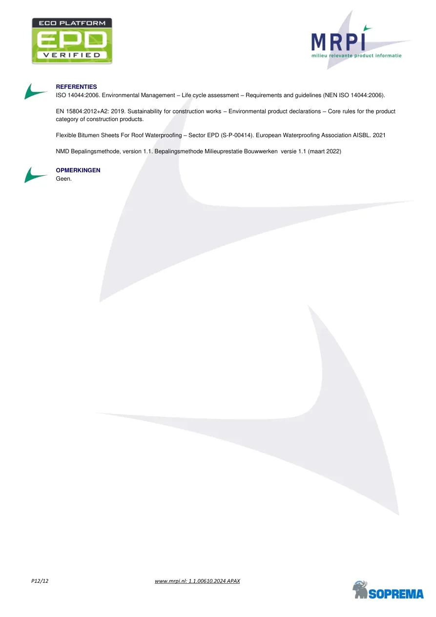 P12/12 www.mrpi.nl: 1.1.00610.2024 APAX REFERENTIES ISO 14044:2006. Environmental Management – Life cycle assessment – Requirements and guidelines (NEN ISO 14044:2006). EN 15804:2012+A2: 2019. Sustainability for construction works – Environmental product declarations – Core rules for the product category of construction products. Flexible Bitumen Sheets For Roof Waterproofing – Sector EPD (S-P-00414). European Waterproofing Association AISBL. 2021 NMD Bepalingsmethode, version 1.1. Bepalingsmethode Milieuprestatie Bouwwerken versie 1.1 (maart 2022) OPMERKINGEN Geen.