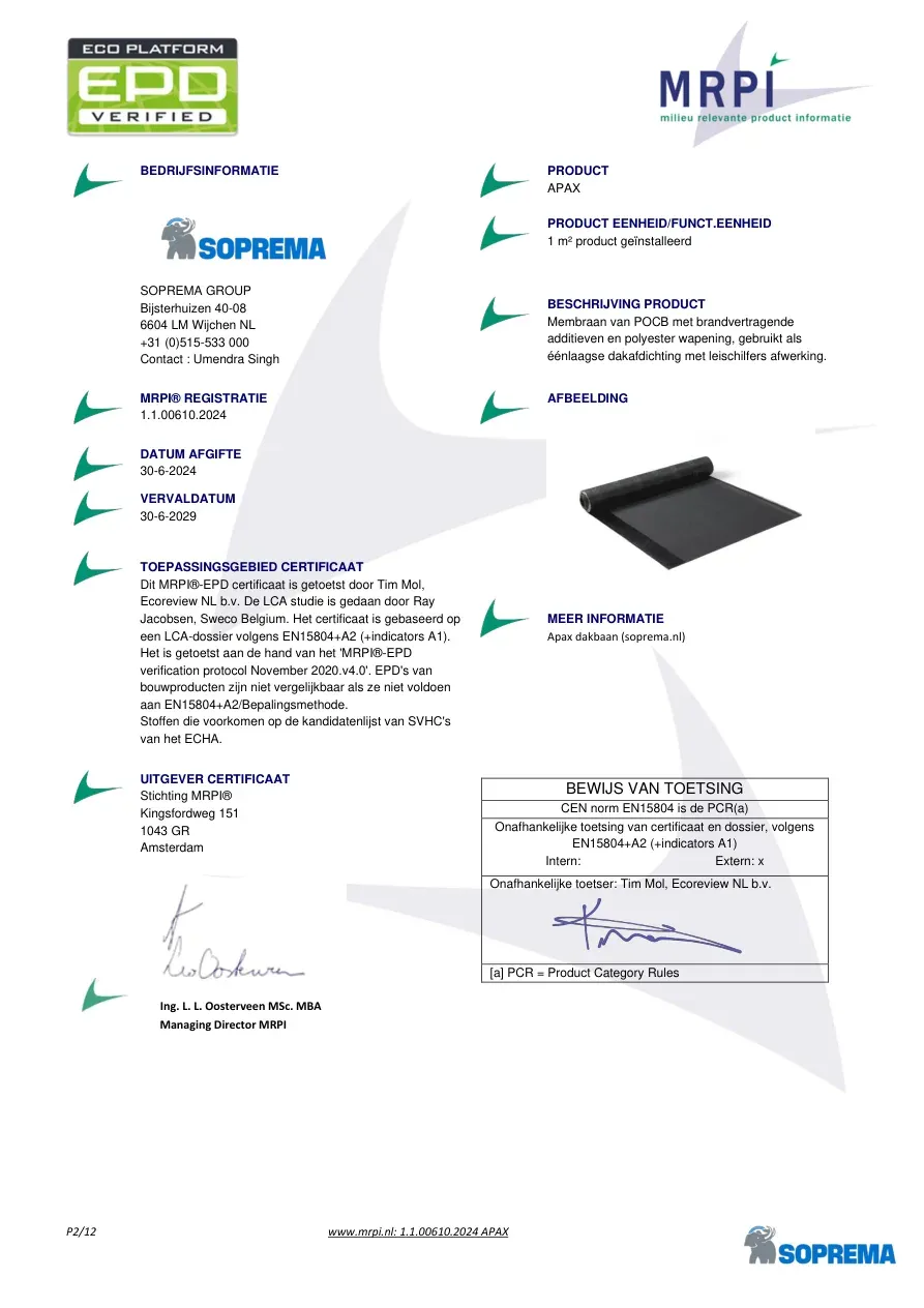 P2/12 www.mrpi.nl: 1.1.00610.2024 APAX BEDRIJFSINFORMATIE SOPREMA GROUP Bijsterhuizen 40-08 6604 LM Wijchen NL +31 (0)515-533 000 Contact : Umendra Singh PRODUCT APAX PRODUCT EENHEID/FUNCT.EENHEID 1 m² product geïnstalleerd BESCHRIJVING PRODUCT Membraan van POCB met brandvertragende additieven en polyester wapening, gebruikt als éénlaagse dakafdichting met leischilfers afwerking. MRPI® REGISTRATIE 1.1.00610.2024 AFBEELDING MEER INFORMATIE Apax dakbaan (soprema.nl) DATUM AFGIFTE 30-6-2024 VERVALDATUM 30-6-2029 TOEPASSINGSGEBIED CERTIFICAAT Dit MRPI®-EPD certificaat is getoetst door Tim Mol, Ecoreview NL b.v. De LCA studie is gedaan door Ray Jacobsen, Sweco Belgium. Het certificaat is gebaseerd op een LCA-dossier volgens EN15804+A2 (+indicators A1). Het is getoetst aan de hand van het 'MRPI®-EPD verification protocol November 2020.v4.0'. EPD's van bouwproducten zijn niet vergelijkbaar als ze niet voldoen aan EN15804+A2/Bepalingsmethode. Stoffen die voorkomen op de kandidatenlijst van SVHC's van het ECHA. UITGEVER CERTIFICAAT Stichting MRPI® Kingsfordweg 151 1043 GR Amsterdam BEWIJS VAN TOETSING CEN norm EN15804 is de PCR(a) Onafhankelijke toetsing van certificaat en dossier, volgens EN15804+A2 (+indicators A1) Intern: Extern: x Onafhankelijke toetser: Tim Mol, Ecoreview NL b.v. [a] PCR = Product Category Rules Ing. L. L. Oosterveen MSc. MBA Managing Director MRPI