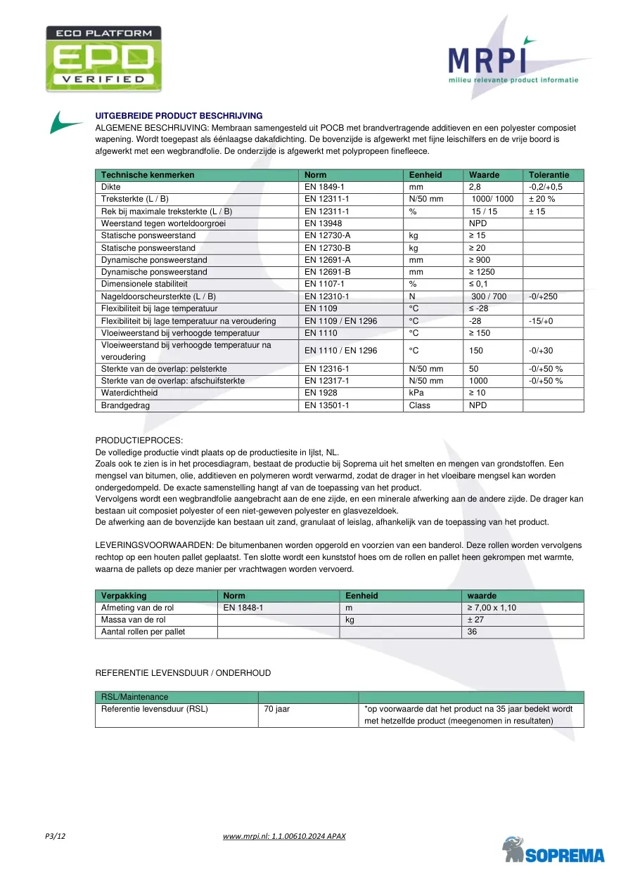 P3/12 www.mrpi.nl: 1.1.00610.2024 APAX UITGEBREIDE PRODUCT BESCHRIJVING ALGEMENE BESCHRIJVING: Membraan samengesteld uit POCB met brandvertragende additieven en een polyester composiet wapening. Wordt toegepast als éénlaagse dakafdichting. De bovenzijde is afgewerkt met fijne leischilfers en de vrije boord is afgewerkt met een wegbrandfolie. De onderzijde is afgewerkt met polypropeen finefleece. Technische kenmerken Norm Eenheid Waarde Tolerantie Dikte EN 1849-1 mm 2,8 -0,2/+0,5 Treksterkte (L / B) EN 12311-1 N/50 mm 1000/ 1000 ± 20 % Rek bij maximale treksterkte (L / B) EN 12311-1 % 15 / 15 ± 15 Weerstand tegen worteldoorgroei EN 13948 NPD Statische ponsweerstand EN 12730-A kg ≥ 15 Statische ponsweerstand EN 12730-B kg ≥ 20 Dynamische ponsweerstand EN 12691-A mm ≥ 900 Dynamische ponsweerstand EN 12691-B mm ≥ 1250 Dimensionele stabiliteit EN 1107-1 % ≤ 0,1 Nageldoorscheursterkte (L / B) EN 12310-1 N 300 / 700 -0/+250 Flexibiliteit bij lage temperatuur EN 1109 °C ≤ -28 Flexibiliteit bij lage temperatuur na veroudering EN 1109 / EN 1296 °C -28 -15/+0 Vloeiweerstand bij verhoogde temperatuur EN 1110 °C ≥ 150 Vloeiweerstand bij verhoogde temperatuur na veroudering EN 1110 / EN 1296 °C 150 -0/+30 Sterkte van de overlap: pelsterkte EN 12316-1 N/50 mm 50 -0/+50 % Sterkte van de overlap: afschuifsterkte EN 12317-1 N/50 mm 1000 -0/+50 % Waterdichtheid EN 1928 kPa ≥ 10 Brandgedrag EN 13501-1 Class NPD PRODUCTIEPROCES: De volledige productie vindt plaats op de productiesite in Ijlst, NL. Zoals ook te zien is in het procesdiagram, bestaat de productie bij Soprema uit het smelten en mengen van grondstoffen. Een mengsel van bitumen, olie, additieven en polymeren wordt verwarmd, zodat de drager in het vloeibare mengsel kan worden ondergedompeld. De exacte samenstelling hangt af van de toepassing van het product. Vervolgens wordt een wegbrandfolie aangebracht aan de ene zijde, en een minerale afwerking aan de andere zijde. De drager kan bestaan uit composiet polyester of een niet-geweven polyester en glasvezeldoek. De afwerking aan de bovenzijde kan bestaan uit zand, granulaat of leislag, afhankelijk van de toepassing van het product. LEVERINGSVOORWAARDEN: De bitumenbanen worden opgerold en voorzien van een banderol. Deze rollen worden vervolgens rechtop op een houten pallet geplaatst. Ten slotte wordt een kunststof hoes om de rollen en pallet heen gekrompen met warmte, waarna de pallets op deze manier per vrachtwagen worden vervoerd. Verpakking Norm Eenheid waarde Afmeting van de rol EN 1848-1 m ≥ 7,00 x 1,10 Massa van de rol kg ± 27 Aantal rollen per pallet 36 REFERENTIE LEVENSDUUR / ONDERHOUD RSL/Maintenance Referentie levensduur (RSL) 70 jaar *op voorwaarde dat het product na 35 jaar bedekt wordt met hetzelfde product (meegenomen in resultaten)