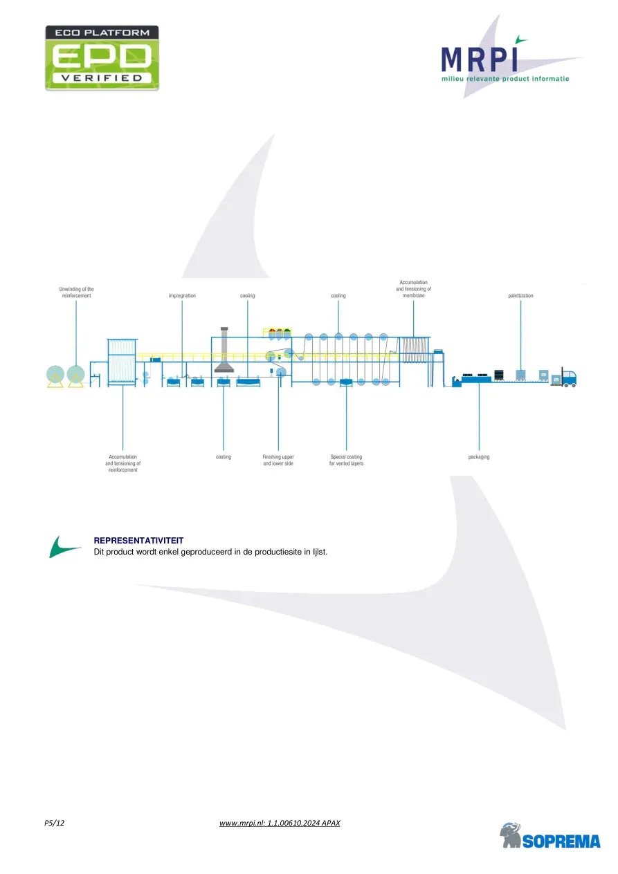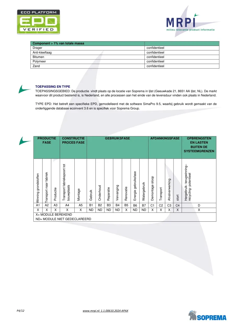 P4/12 www.mrpi.nl: 1.1.00610.2024 APAX Component > 1% van totale massa Drager confidentieel Anti-kleeflaag confidentieel Bitumen confidentieel Polymeer confidentieel Zand confidentieel TOEPASSING EN TYPE TOEPASSINGSGEBIED: De productie vindt plaats op de locatie van Soprema in Ijlst (Geeuwkade 21, 8651 AA Ijlst, NL). De markt waarvoor dit product bestemd is, is Nederland, en alle processen aan het einde van de levensduur vinden ook plaats in Nederland. TYPE EPD: Het betreft een specifieke EPD, gemodelleerd met de software SimaPro 9.5, waarbij gebruik wordt gemaakt van de onderliggende database ecoinvent 3.6 en is specifiek voor Soprema Group. PRODUCTIE FASE CONSTRUCTIE PROCES FASE GEBRUIKSFASE AFDANKINGSFASE OPBRENGSTEN EN LASTEN BUITEN DE SYSTEEMGRENZEN Winning grondstoffen Transport naar fabriek Productie Transport fabriekspoort tot bouwplaats Montage Gebruik Onderhoud Reparatie Vervanging Renovatie Energie gebruiksfase Watergebruik Demontage sloop Transport Afvalverwerking stort Hergebruik- terugwinning– recycling- potentieel A1 A2 A3 A4 A5 B1 B2 B3 B4 B5 B6 B7 C1 C2 C3 C4 D X X X X X ND ND ND ND X ND ND X X X X X X= MODULE BEREKEND ND= MODULE NIET GEDECLAREERD