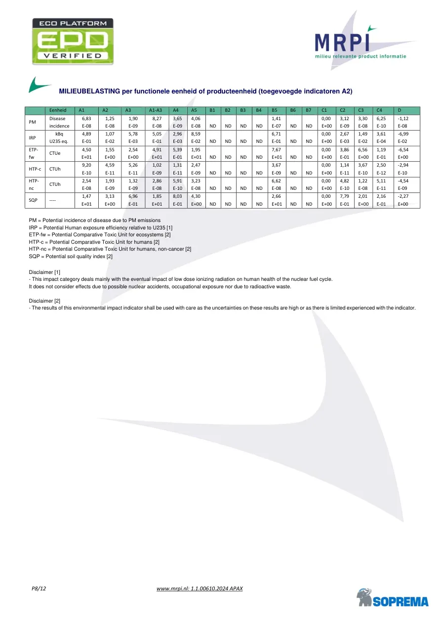 P8/12 www.mrpi.nl: 1.1.00610.2024 APAX MILIEUBELASTING per functionele eenheid of producteenheid (toegevoegde indicatoren A2) Eenheid A1 A2 A3 A1-A3 A4 A5 B1 B2 B3 B4 B5 B6 B7 C1 C2 C3 C4 D PM Disease incidence 6,83 E-08 1,25 E-08 1,90 E-09 8,27 E-08 3,65 E-09 4,06 E-08 ND ND ND ND 1,41 E-07 ND ND 0,00 E+00 3,12 E-09 3,30 E-08 6,25 E-10 -1,12 E-08 IRP kBq U235 eq. 4,89 E-01 1,07 E-02 5,78 E-03 5,05 E-01 2,96 E-03 8,59 E-02 ND ND ND ND 6,71 E-01 ND ND 0,00 E+00 2,67 E-03 1,49 E-02 3,61 E-04 -6,99 E-02 ETP-fw CTUe 4,50 E+01 1,55 E+00 2,54 E+00 4,91 E+01 5,39 E-01 1,95 E+01 ND ND ND ND 7,67 E+01 ND ND 0,00 E+00 3,86 E-01 6,56 E+00 1,19 E-01 -6,54 E+00 HTP-c CTUh 9,20 E-10 4,59 E-11 5,26 E-11 1,02 E-09 1,31 E-11 2,47 E-09 ND ND ND ND 3,67 E-09 ND ND 0,00 E+00 1,14 E-11 3,67 E-10 2,50 E-12 -2,94 E-10 HTP-nc CTUh 2,54 E-08 1,93 E-09 1,32 E-09 2,86 E-08 5,91 E-10 3,23 E-08 ND ND ND ND 6,62 E-08 ND ND 0,00 E+00 4,82 E-10 1,22 E-08 5,11 E-11 -4,54 E-09 SQP ---- 1,47 E+01 3,13 E+00 6,96 E-01 1,85 E+01 8,03 E-01 4,30 E+00 ND ND ND ND 2,66 E+01 ND ND 0,00 E+00 7,79 E-01 2,01 E+00 2,16 E-01 -2,27 E+00 PM = Potential incidence of disease due to PM emissions IRP = Potential Human exposure efficiency relative to U235 [1] ETP-fw = Potential Comparative Toxic Unit for ecosystems [2] HTP-c = Potential Comparative Toxic Unit for humans [2] HTP-nc = Potential Comparative Toxic Unit for humans, non-cancer [2] SQP = Potential soil quality index [2] Disclaimer [1] - This impact category deals mainly with the eventual impact of low dose ionizing radiation on human health of the nuclear fuel cycle. It does not consider effects due to possible nuclear accidents, occupational exposure nor due to radioactive waste. Disclaimer [2] - The results of this environmental impact indicator shall be used with care as the uncertainties on these results are high or as there is limited experienced with the indicator.