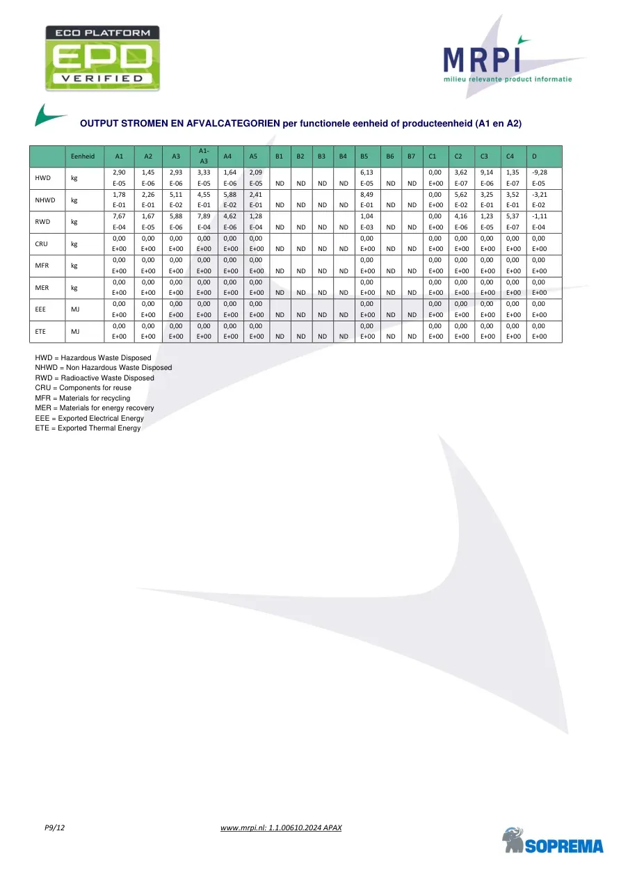 P9/12 www.mrpi.nl: 1.1.00610.2024 APAX OUTPUT STROMEN EN AFVALCATEGORIEN per functionele eenheid of producteenheid (A1 en A2) Eenheid A1 A2 A3 A1-A3 A4 A5 B1 B2 B3 B4 B5 B6 B7 C1 C2 C3 C4 D HWD kg 2,90 E-05 1,45 E-06 2,93E-06 3,33 E-05 1,64E-06 2,09E-05 ND ND ND ND 6,13E-05 ND ND 0,00E+00 3,62E-07 9,14E-06 1,35E-07 -9,28 E-05 NHWD kg 1,78 E-01 2,26 E-01 5,11E-02 4,55 E-01 5,88E-02 2,41E-01 ND ND ND ND 8,49E-01 ND ND 0,00E+00 5,62E-02 3,25E-01 3,52E-01 -3,21 E-02 RWD kg 7,67 E-04 1,67 E-05 5,88E-06 7,89 E-04 4,62E-06 1,28E-04 ND ND ND ND 1,04E-03 ND ND 0,00E+00 4,16E-06 1,23E-05 5,37E-07 -1,11 E-04 CRU kg 0,00 E+00 0,00 E+00 0,00E+00 0,00 E+00 0,00E+00 0,00E+00 ND ND ND ND 0,00E+00 ND ND 0,00E+00 0,00E+00 0,00E+00 0,00E+00 0,00 E+00 MFR kg 0,00 E+00 0,00 E+00 0,00E+00 0,00 E+00 0,00E+00 0,00E+00 ND ND ND ND 0,00E+00 ND ND 0,00E+00 0,00E+00 0,00E+00 0,00E+00 0,00 E+00 MER kg 0,00 E+00 0,00 E+00 0,00E+00 0,00 E+00 0,00E+00 0,00E+00 ND ND ND ND 0,00E+00 ND ND 0,00E+00 0,00E+00 0,00E+00 0,00E+00 0,00 E+00 EEE MJ 0,00 E+00 0,00 E+00 0,00E+00 0,00 E+00 0,00E+00 0,00E+00 ND ND ND ND 0,00E+00 ND ND 0,00E+00 0,00E+00 0,00E+00 0,00E+00 0,00 E+00 ETE MJ 0,00 E+00 0,00 E+00 0,00E+00 0,00 E+00 0,00E+00 0,00E+00 ND ND ND ND 0,00E+00 ND ND 0,00E+00 0,00E+00 0,00E+00 0,00E+00 0,00 E+00 HWD = Hazardous Waste Disposed NHWD = Non Hazardous Waste Disposed RWD = Radioactive Waste Disposed CRU = Components for reuse MFR = Materials for recycling MER = Materials for energy recovery EEE = Exported Electrical Energy ETE = Exported Thermal Energy