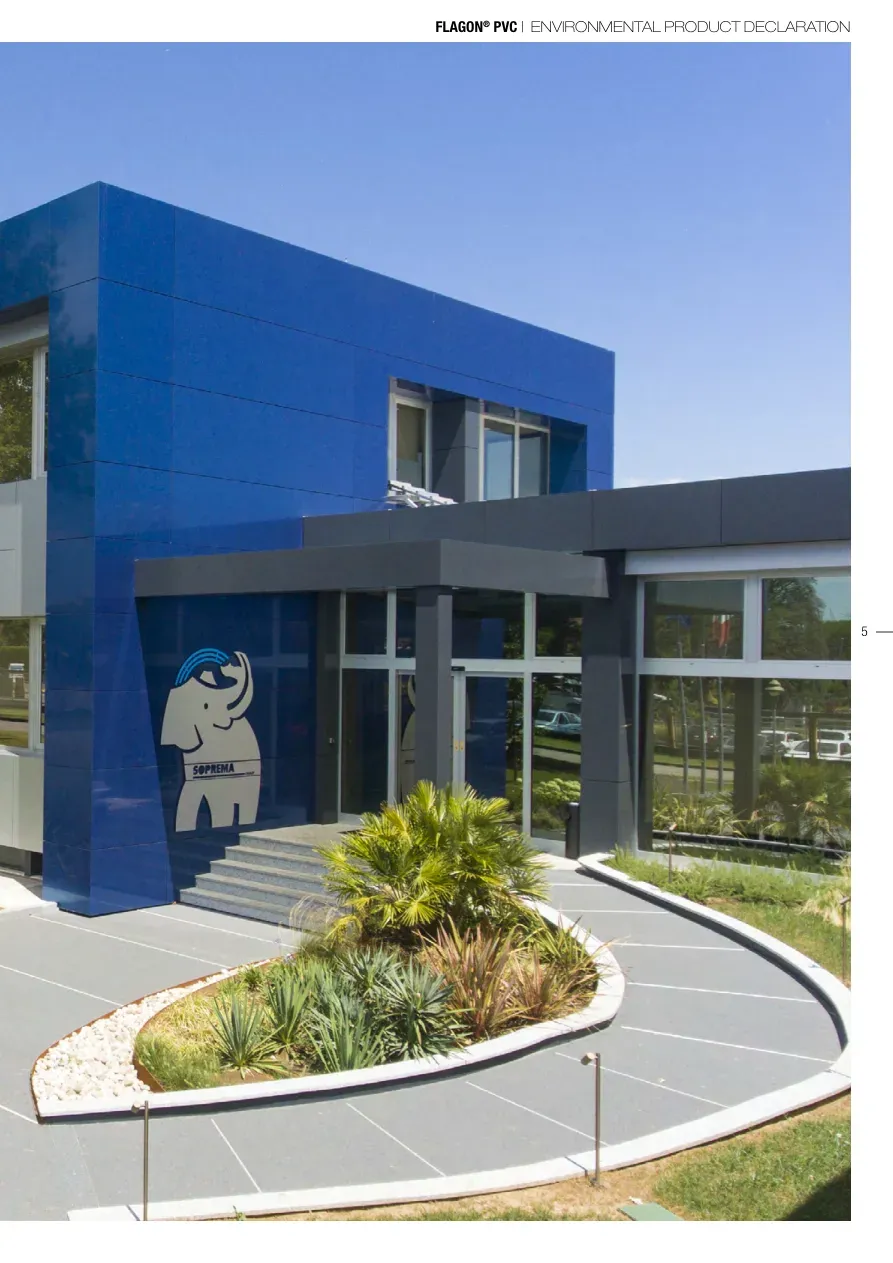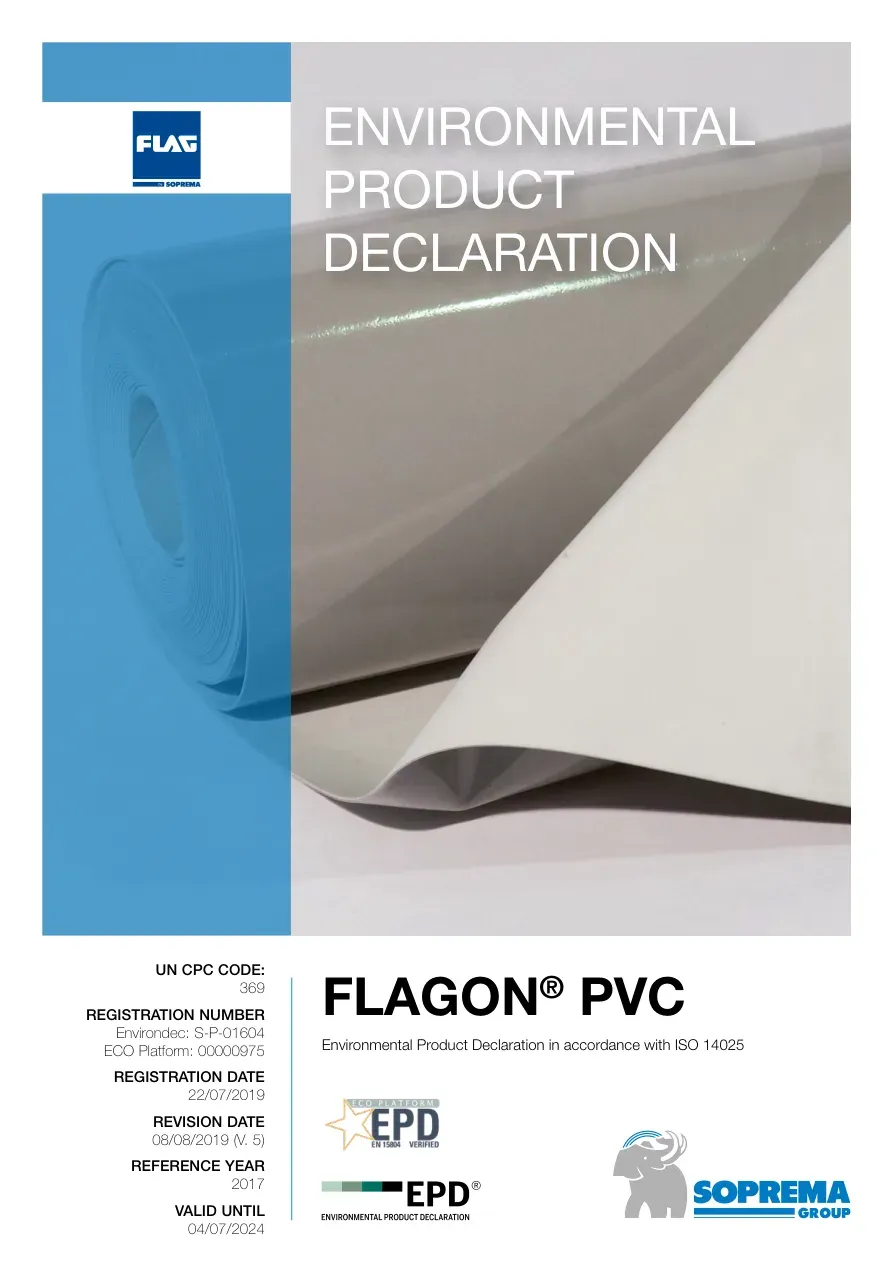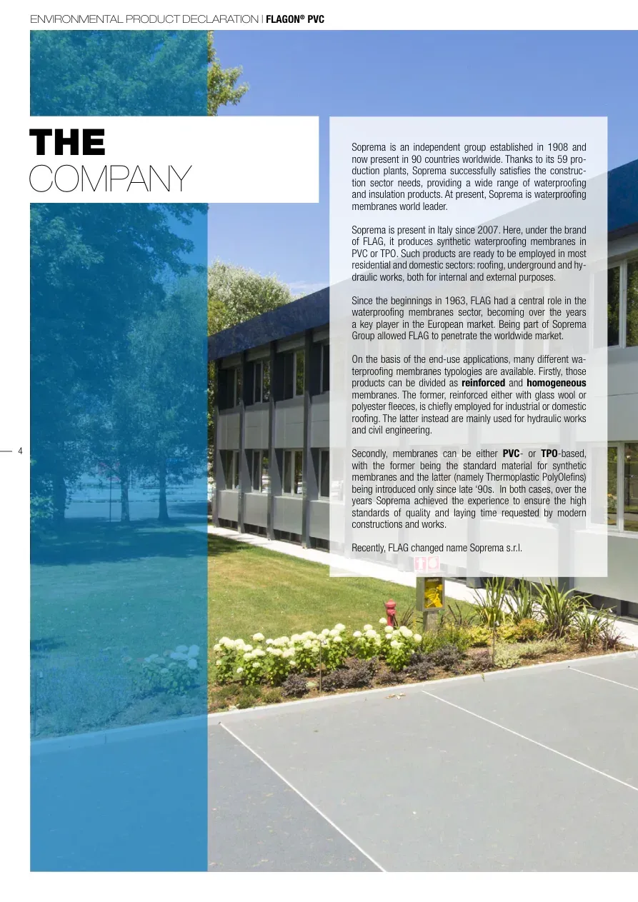 ENVIRONMENTAL PRODUCT DECLARATION | FLAGON® PVC4THECOMPANYSoprema is an independent group established in 1908 and now present in 90 countries worldwide. Thanks to its 59 pro-duction plants, Soprema successfully satisfies the construc-tion sector needs, providing a wide range of waterproofing and insulation products. At present, Soprema is waterproofing membranes world leader. Soprema is present in Italy since 2007. Here, under the brand of FLAG, it produces synthetic waterproofing membranes in PVC or TPO. Such products are ready to be employed in most residential and domestic sectors: roofing, underground and hy-draulic works, both for internal and external purposes.Since the beginnings in 1963, FLAG had a central role in the waterproofing membranes sector, becoming over the years a key player in the European market. Being part of Soprema Group allowed FLAG to penetrate the worldwide market. On the basis of the end-use applications, many different wa-terproofing membranes typologies are available. Firstly, those products can be divided as reinforced and homogeneous membranes. The former, reinforced either with glass wool or polyester fleeces, is chiefly employed for industrial or domestic roofing. The latter instead are mainly used for hydraulic works and civil engineering.Secondly, membranes can be either PVC- or TPO-based, with the former being the standard material for synthetic membranes and the latter (namely Thermoplastic PolyOlefins) being introduced only since late ‘90s. In both cases, over the years Soprema achieved the experience to ensure the high standards of quality and laying time requested by modern constructions and works. Recently, FLAG changed name Soprema s.r.l.