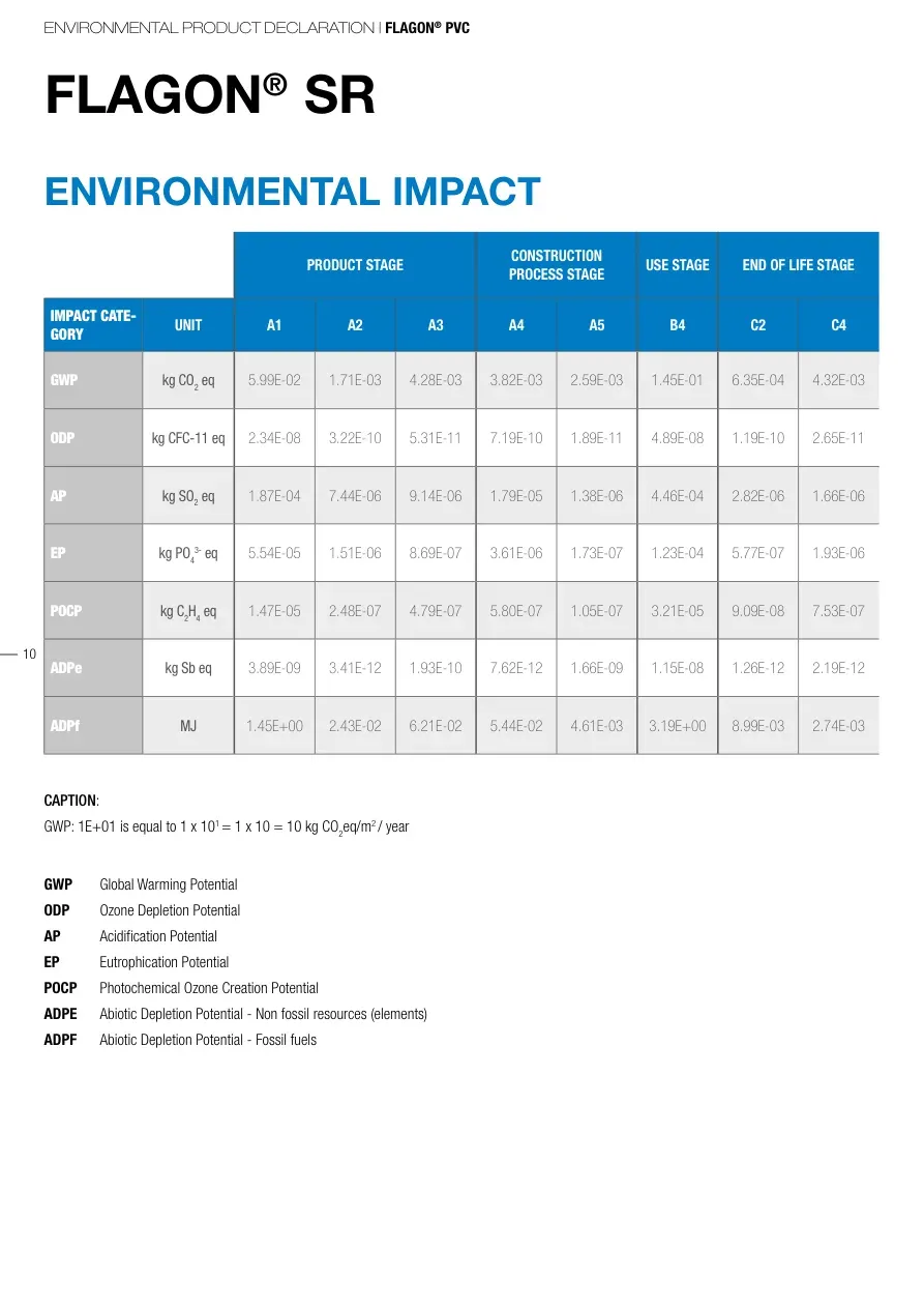 ENVIRONMENTAL PRODUCT DECLARATION | FLAGON® PVC10FLAGON® SRENVIRONMENTAL IMPACTPRODUCT STAGECONSTRUCTION PROCESS STAGEUSE STAGEEND OF LIFE STAGEIMPACT CATE-GORYUNITA1 A2A3A4A5B4C2C4GWPkg CO2 eq5.99E-021.71E-034.28E-033.82E-032.59E-031.45E-016.35E-044.32E-03ODPkg CFC-11 eq2.34E-083.22E-105.31E-117.19E-101.89E-114.89E-081.19E-102.65E-11APkg SO2 eq1.87E-047.44E-069.14E-061.79E-051.38E-064.46E-042.82E-061.66E-06EPkg PO43- eq5.54E-051.51E-068.69E-073.61E-061.73E-071.23E-045.77E-071.93E-06POCPkg C2H4 eq1.47E-052.48E-074.79E-075.80E-071.05E-073.21E-059.09E-087.53E-07ADPekg Sb eq3.89E-093.41E-121.93E-107.62E-121.66E-091.15E-081.26E-122.19E-12ADPfMJ1.45E+002.43E-026.21E-025.44E-024.61E-033.19E+008.99E-032.74E-03GWP Global Warming PotentialODP Ozone Depletion Potential AP Acidification Potential EP Eutrophication Potential POCP Photochemical Ozone Creation PotentialADPE Abiotic Depletion Potential - Non fossil resources (elements)ADPF Abiotic Depletion Potential - Fossil fuelsCAPTION: GWP: 1E+01 is equal to 1 x 101 = 1 x 10 = 10 kg CO2eq/m2 / year
