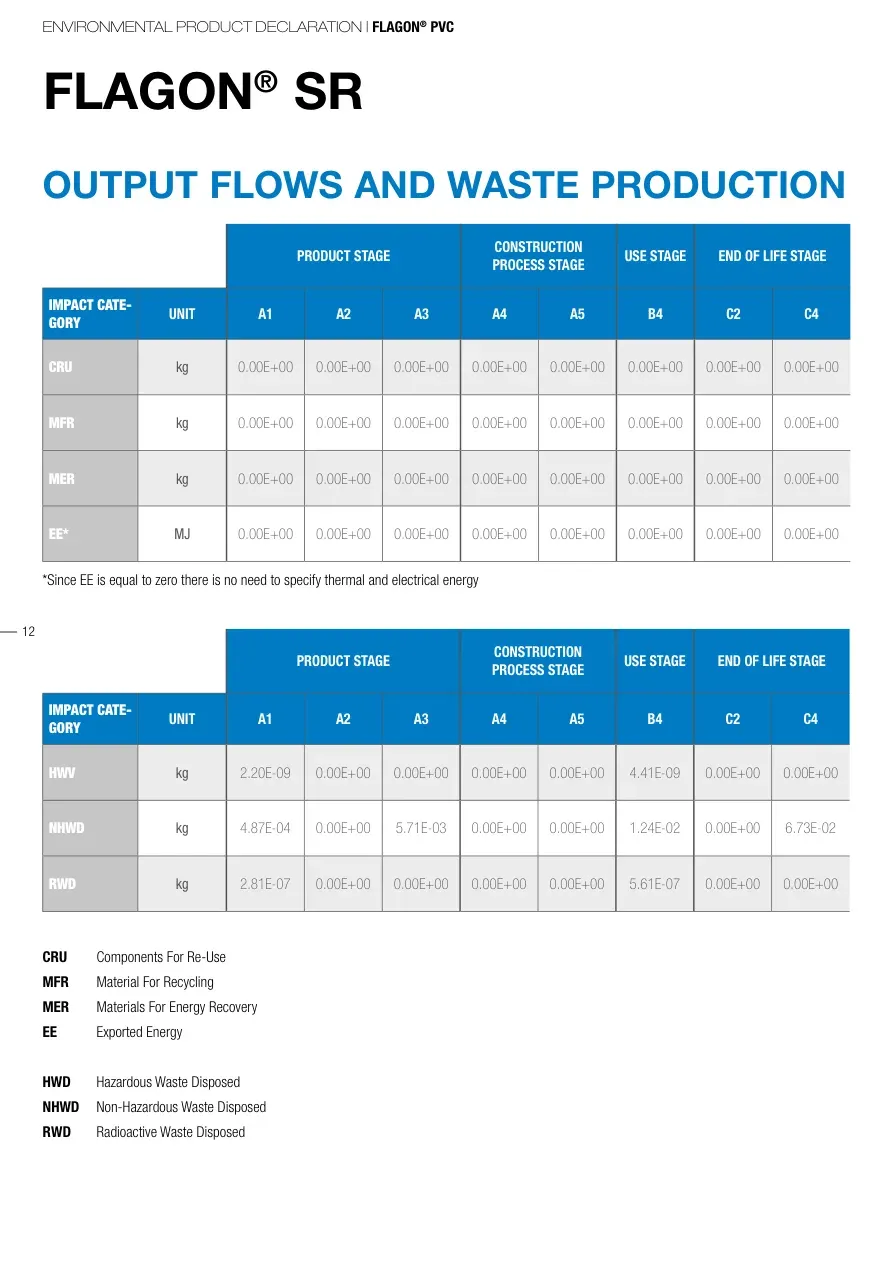 ENVIRONMENTAL PRODUCT DECLARATION | FLAGON® PVC12FLAGON® SROUTPUT FLOWS AND WASTE PRODUCTION CRU Components For Re-Use MFR Material For Recycling MER Materials For Energy Recovery EE Exported Energy HWD Hazardous Waste DisposedNHWD Non-Hazardous Waste Disposed RWD Radioactive Waste DisposedPRODUCT STAGECONSTRUCTION PROCESS STAGEUSE STAGEEND OF LIFE STAGEIMPACT CATE-GORYUNITA1 A2A3A4A5B4C2C4CRUkg0.00E+000.00E+000.00E+000.00E+000.00E+000.00E+000.00E+000.00E+00MFRkg0.00E+000.00E+000.00E+000.00E+000.00E+000.00E+000.00E+000.00E+00MERkg0.00E+000.00E+000.00E+000.00E+000.00E+000.00E+000.00E+000.00E+00EE*MJ0.00E+000.00E+000.00E+000.00E+000.00E+000.00E+000.00E+000.00E+00PRODUCT STAGECONSTRUCTION PROCESS STAGEUSE STAGEEND OF LIFE STAGEIMPACT CATE-GORYUNITA1 A2A3A4A5B4C2C4HWVkg2.20E-090.00E+000.00E+000.00E+000.00E+004.41E-090.00E+000.00E+00NHWDkg4.87E-040.00E+005.71E-030.00E+000.00E+001.24E-020.00E+006.73E-02RWDkg2.81E-070.00E+000.00E+000.00E+000.00E+005.61E-070.00E+000.00E+00*Since EE is equal to zero there is no need to specify thermal and electrical energy