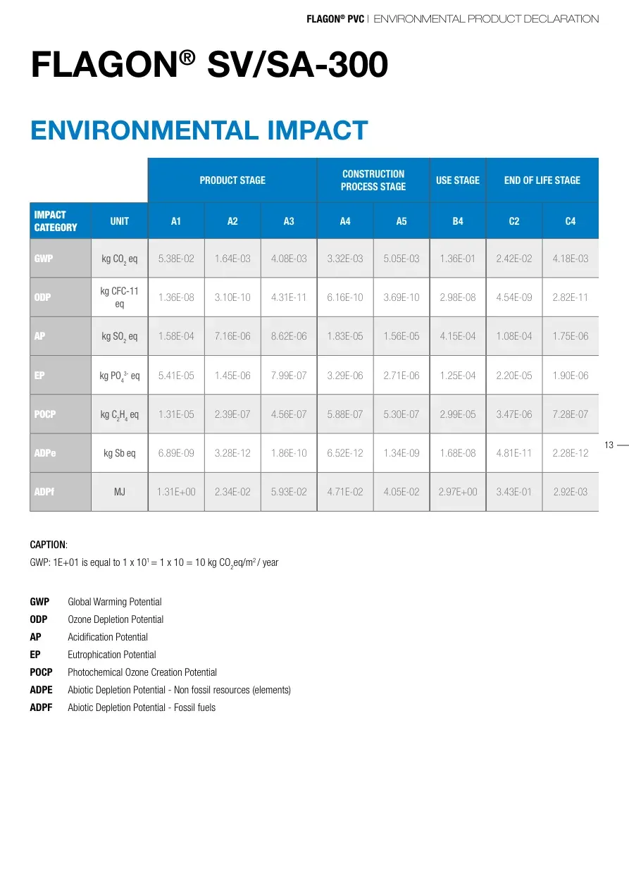 FLAGON® PVC | ENVIRONMENTAL PRODUCT DECLARATION13FLAGON® SV/SA-300ENVIRONMENTAL IMPACTPRODUCT STAGECONSTRUCTION PROCESS STAGEUSE STAGEEND OF LIFE STAGEIMPACT CATEGORYUNITA1 A2A3A4A5B4C2C4GWPkg CO2 eq5.38E-021.64E-034.08E-033.32E-035.05E-031.36E-012.42E-024.18E-03ODPkg CFC-11 eq1.36E-083.10E-104.31E-116.16E-103.69E-102.98E-084.54E-092.82E-11APkg SO2 eq1.58E-047.16E-068.62E-061.83E-051.56E-054.15E-041.08E-041.75E-06EPkg PO43- eq5.41E-051.45E-067.99E-073.29E-062.71E-061.25E-042.20E-051.90E-06POCPkg C2H4 eq1.31E-052.39E-074.56E-075.88E-075.30E-072.99E-053.47E-067.28E-07ADPekg Sb eq6.89E-093.28E-121.86E-106.52E-121.34E-091.68E-084.81E-112.28E-12ADPfMJ1.31E+002.34E-025.93E-024.71E-024.05E-022.97E+003.43E-012.92E-03GWP Global Warming PotentialODP Ozone Depletion Potential AP Acidification Potential EP Eutrophication Potential POCP Photochemical Ozone Creation PotentialADPE Abiotic Depletion Potential - Non fossil resources (elements)ADPF Abiotic Depletion Potential - Fossil fuelsCAPTION: GWP: 1E+01 is equal to 1 x 101 = 1 x 10 = 10 kg CO2eq/m2 / year