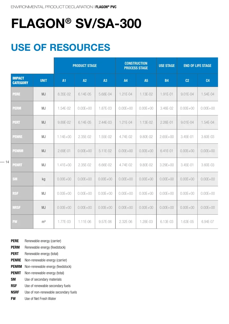 ENVIRONMENTAL PRODUCT DECLARATION | FLAGON® PVC14FLAGON® SV/SA-300USE OF RESOURCESPRODUCT STAGECONSTRUCTION PROCESS STAGEUSE STAGEEND OF LIFE STAGEIMPACT CATEGORYUNITA1 A2A3A4A5B4C2C4PEREMJ8.35E-026.14E-055.68E-041.21E-041.13E-021.91E-019.01E-041.54E-04PERMMJ1.54E-020.00E+001.87E-030.00E+000.00E+003.46E-020.00E+000.00E+00PERTMJ9.89E-026.14E-052.44E-031.21E-041.13E-022.26E-019.01E-041.54E-04PENREMJ1.14E+002.35E-021.55E-024.74E-029.80E-022.65E+003.45E-013.60E-03PENRMMJ2.69E-010.00E+005.11E-020.00E+000.00E+006.41E-010.00E+000.00E+00PENRTMJ1.41E+002.35E-026.66E-024.74E-029.80E-023.29E+003.45E-013.60E-03SMkg0.00E+000.00E+000.00E+000.00E+000.00E+000.00E+000.00E+000.00E+00RSFMJ0.00E+000.00E+000.00E+000.00E+000.00E+000.00E+000.00E+000.00E+00NRSFMJ0.00E+000.00E+000.00E+000.00E+000.00E+000.00E+000.00E+000.00E+00FW1.77E-031.11E-069.57E-062.32E-061.28E-036.13E-031.63E-056.94E-07PERE Renewable energy (carrier) PERM Renewable energy (feedstock)PERT Renewable energy (total) PENRE Non-renewable energy (carrier)PENRM Non-renewable energy (feedstock)PENRT Non-renewable energy (total)SM Use of secondary materials RSF Use of renewable secondary fuelsNSRF Use of non-renewable secondary fuels FW Use of Net Fresh Water
