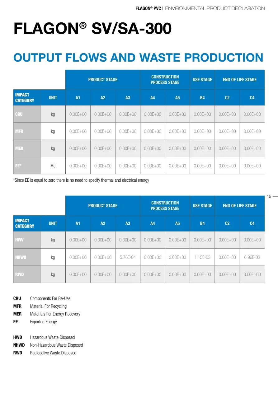 FLAGON® PVC | ENVIRONMENTAL PRODUCT DECLARATION15FLAGON® SV/SA-300OUTPUT FLOWS AND WASTE PRODUCTION PRODUCT STAGECONSTRUCTION PROCESS STAGEUSE STAGEEND OF LIFE STAGEIMPACT CATEGORYUNITA1 A2A3A4A5B4C2C4CRUkg0.00E+000.00E+000.00E+000.00E+000.00E+000.00E+000.00E+000.00E+00MFRkg0.00E+000.00E+000.00E+000.00E+000.00E+000.00E+000.00E+000.00E+00MERkg0.00E+000.00E+000.00E+000.00E+000.00E+000.00E+000.00E+000.00E+00EE*MJ0.00E+000.00E+000.00E+000.00E+000.00E+000.00E+000.00E+000.00E+00PRODUCT STAGECONSTRUCTION PROCESS STAGEUSE STAGEEND OF LIFE STAGEIMPACT CATEGORYUNITA1 A2A3A4A5B4C2C4HWVkg0.00E+000.00E+000.00E+000.00E+000.00E+000.00E+000.00E+000.00E+00NHWDkg0.00E+000.00E+005.76E-040.00E+000.00E+001.15E-030.00E+006.96E-02RWDkg0.00E+000.00E+000.00E+000.00E+000.00E+000.00E+000.00E+000.00E+00CRU Components For Re-Use MFR Material For Recycling MER Materials For Energy Recovery EE Exported Energy HWD Hazardous Waste DisposedNHWD Non-Hazardous Waste Disposed RWD Radioactive Waste Disposed*Since EE is equal to zero there is no need to specify thermal and electrical energy