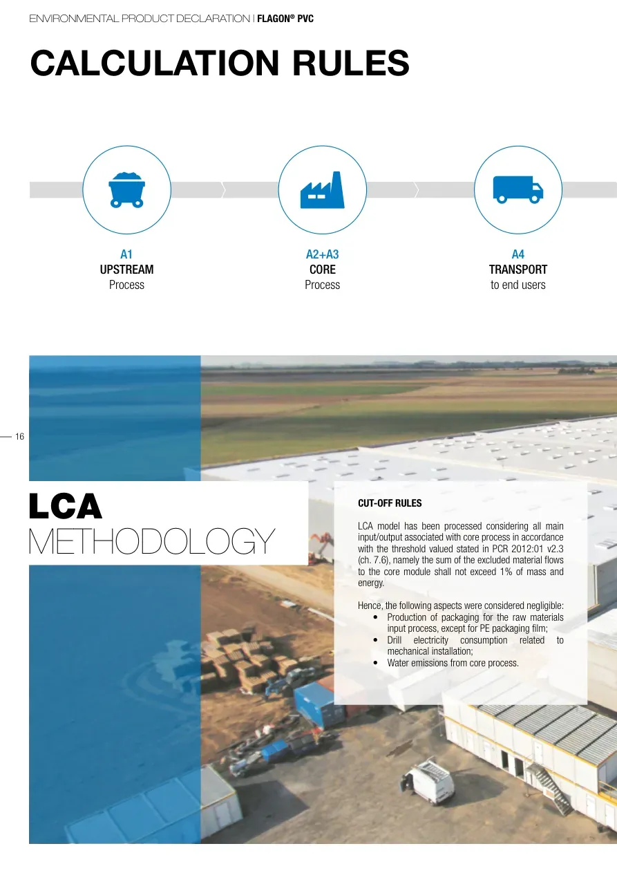 ENVIRONMENTAL PRODUCT DECLARATION | FLAGON® PVC16CALCULATION RULESCUT-OFF RULESLCA model has been processed considering all main input/output associated with core process in accordance with the threshold valued stated in PCR 2012:01 v2.3 (ch. 7.6), namely the sum of the excluded material flows to the core module shall not exceed 1% of mass and energy. Hence, the following aspects were considered negligible:• Production of packaging for the raw materials input process, except for PE packaging film;• Drill electricity consumption related to mechanical installation;• Water emissions from core process.A1UPSTREAM ProcessA2+A3CORE ProcessA4TRANSPORTto end usersLCAMETHODOLOGY