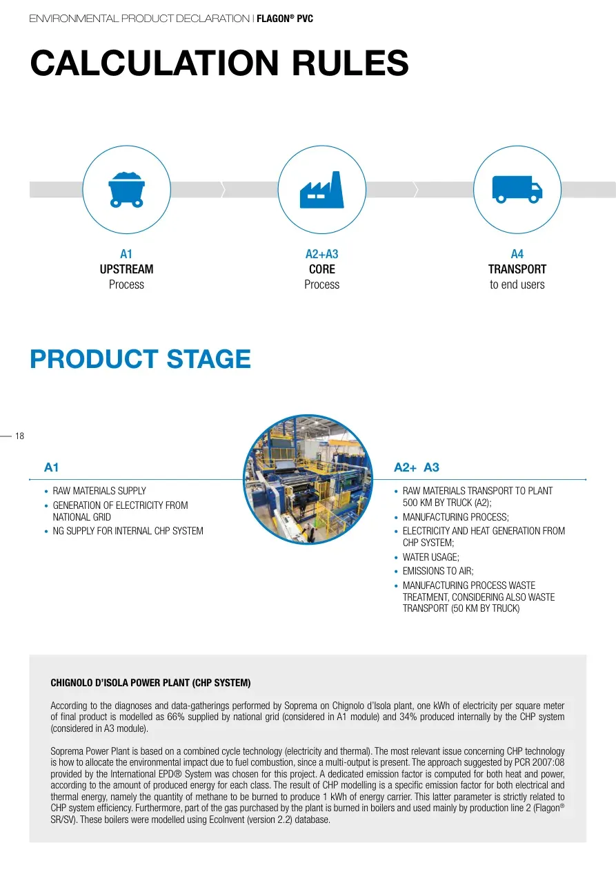 ENVIRONMENTAL PRODUCT DECLARATION | FLAGON® PVC18CALCULATION RULESCHIGNOLO D’ISOLA POWER PLANT (CHP SYSTEM)According to the diagnoses and data-gatherings performed by Soprema on Chignolo d’Isola plant, one kWh of electricity per square meter of final product is modelled as 66% supplied by national grid (considered in A1 module) and 34% produced internally by the CHP system (considered in A3 module).Soprema Power Plant is based on a combined cycle technology (electricity and thermal). The most relevant issue concerning CHP technology is how to allocate the environmental impact due to fuel combustion, since a multi-output is present. The approach suggested by PCR 2007:08 provided by the International EPD® System was chosen for this project. A dedicated emission factor is computed for both heat and power, according to the amount of produced energy for each class. The result of CHP modelling is a specific emission factor for both electrical and thermal energy, namely the quantity of methane to be burned to produce 1 kWh of energy carrier. This latter parameter is strictly related to CHP system efficiency. Furthermore, part of the gas purchased by the plant is burned in boilers and used mainly by production line 2 (Flagon® SR/SV). These boilers were modelled using EcoInvent (version 2.2) database.PRODUCT STAGEA1• RAW MATERIALS SUPPLY• GENERATION OF ELECTRICITY FROM NATIONAL GRID• NG SUPPLY FOR INTERNAL CHP SYSTEM A2+ A3 • RAW MATERIALS TRANSPORT TO PLANT 500 KM BY TRUCK (A2); • MANUFACTURING PROCESS; • ELECTRICITY AND HEAT GENERATION FROM CHP SYSTEM; • WATER USAGE; • EMISSIONS TO AIR; • MANUFACTURING PROCESS WASTE TREATMENT, CONSIDERING ALSO WASTE TRANSPORT (50 KM BY TRUCK)A1UPSTREAM ProcessA2+A3CORE ProcessA4TRANSPORTto end users