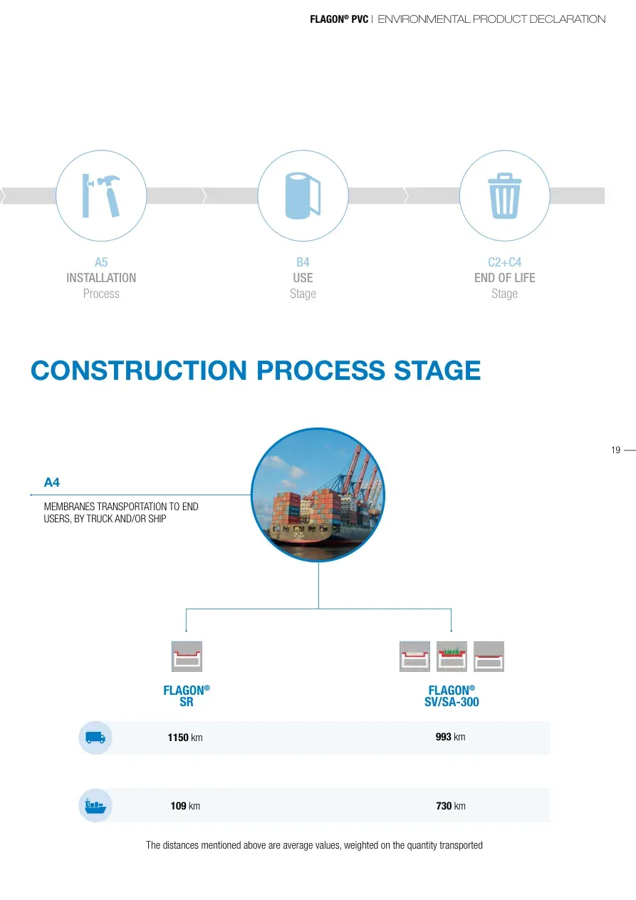 FLAGON® PVC | ENVIRONMENTAL PRODUCT DECLARATION19CONSTRUCTION PROCESS STAGEA4MEMBRANES TRANSPORTATION TO END USERS, BY TRUCK AND/OR SHIPA5INSTALLATION ProcessB4USE StageC2+C4END OF LIFEStageFLAGON® SRFLAGON®SV/SA-3001150 km109 km730 km993 kmThe distances mentioned above are average values, weighted on the quantity transported