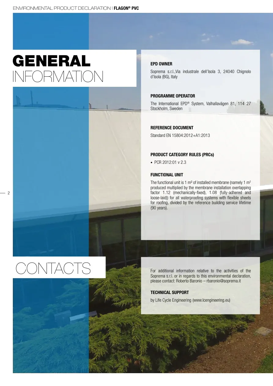 ENVIRONMENTAL PRODUCT DECLARATION | FLAGON® PVC2GENERALINFORMATIONCONTACTS EPD OWNERSoprema s.r.l.,Via industrale dell’Isola 3, 24040 Chignolo d’Isola (BG), ItalyPROGRAMME OPERATORThe International EPD® System, Valhallavägen 81, 114 27 Stockholm, SwedenREFERENCE DOCUMENTStandard EN 15804:2012+A1:2013PRODUCT CATEGORY RULES (PRCs)• PCR 2012:01 v 2.3FUNCTIONAL UNITThe functional unit is 1 m² of installed membrane (namely 1 m2 produced multiplied by the membrane installation overlapping factor 1.12 (mechanically-fixed), 1.08 (fully-adhered and loose-laid)) for all waterproofing systems with flexible sheets for roofing, divided by the reference building service lifetime (90 years).For additional information relative to the activities of the Soprema s.r.l. or in regards to this environmental declaration, please contact: Roberto Baronio – rbaronio@soprema.itTECHNICAL SUPPORT by Life Cycle Engineering (www.lcengineering.eu)