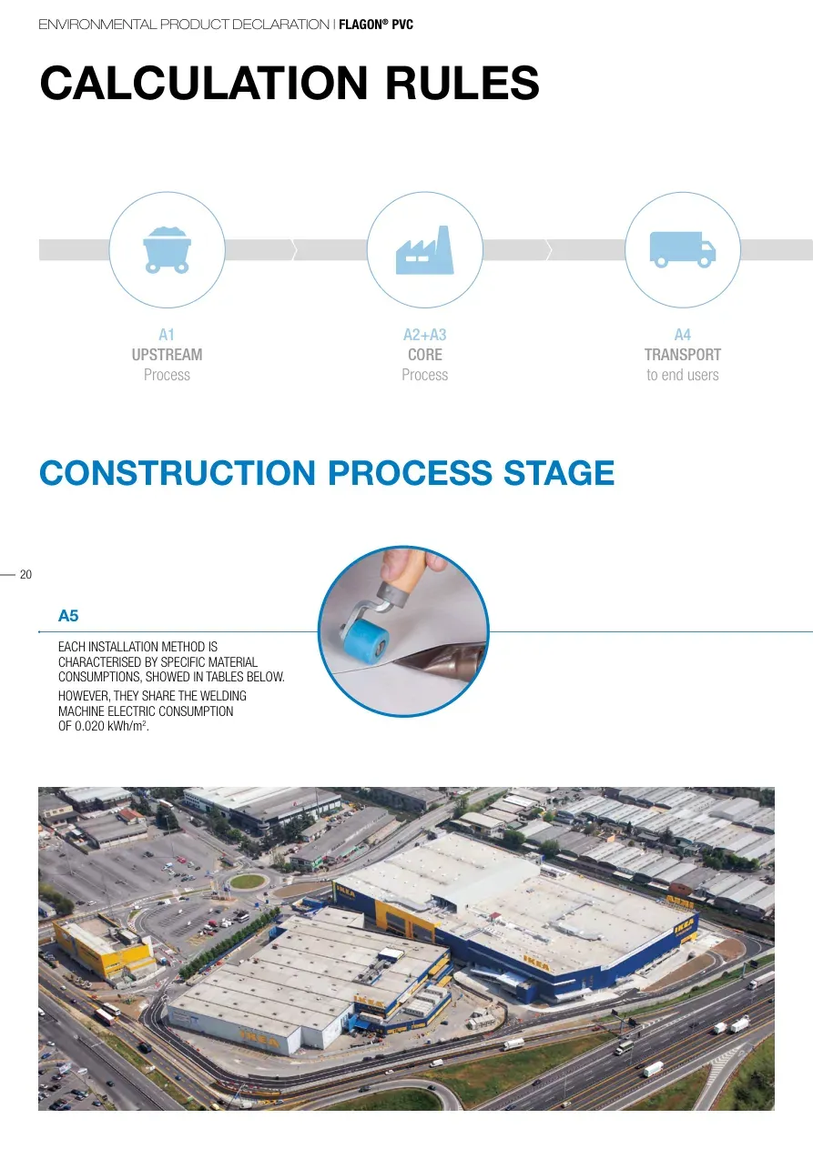ENVIRONMENTAL PRODUCT DECLARATION | FLAGON® PVC20CALCULATION RULESA1UPSTREAM ProcessA2+A3CORE ProcessA4TRANSPORTto end usersCONSTRUCTION PROCESS STAGEA5EACH INSTALLATION METHOD IS CHARACTERISED BY SPECIFIC MATERIAL CONSUMPTIONS, SHOWED IN TABLES BELOW. HOWEVER, THEY SHARE THE WELDING MACHINE ELECTRIC CONSUMPTION OF 0.020 kWh/m2.