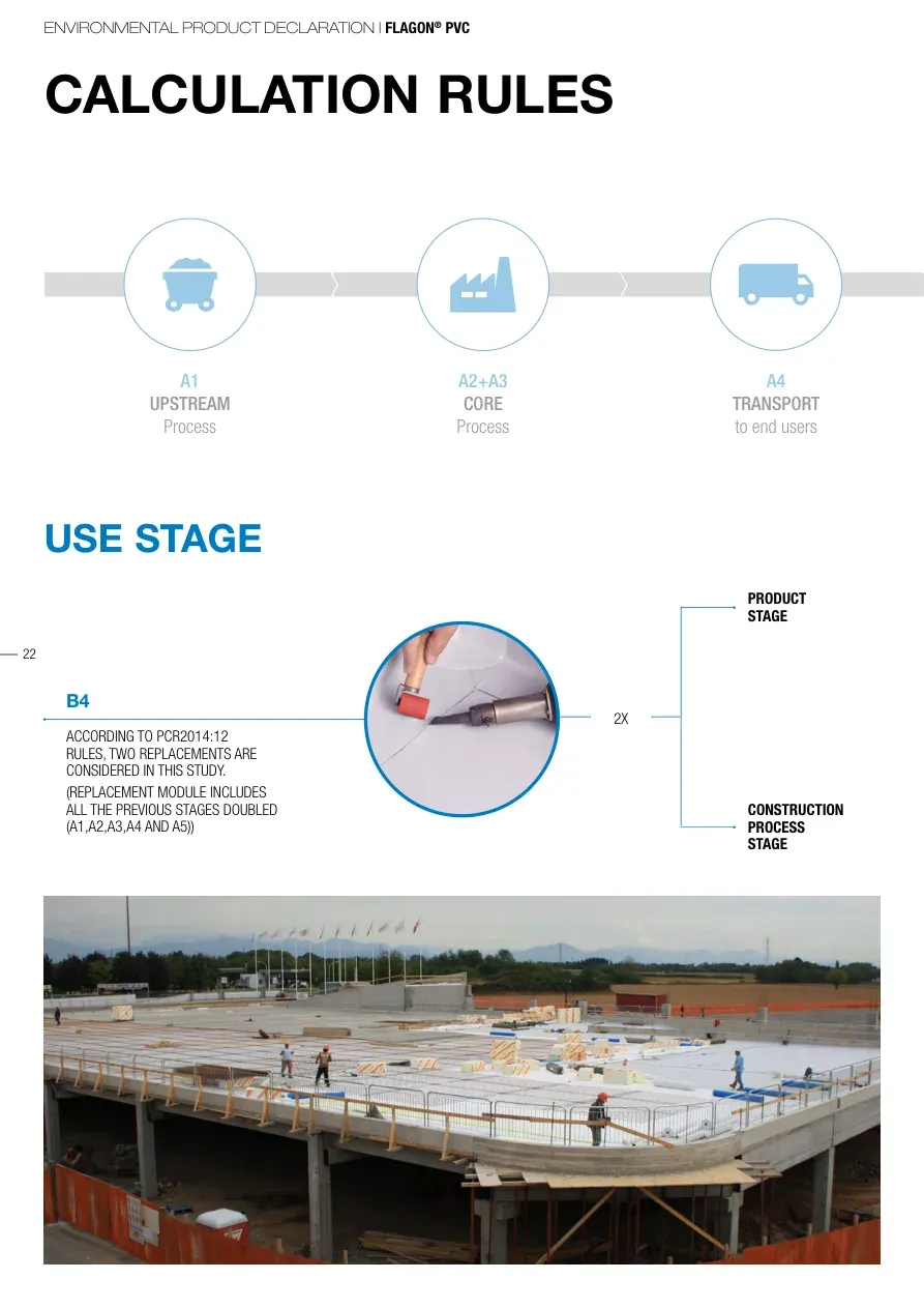 ENVIRONMENTAL PRODUCT DECLARATION | FLAGON® PVC22CALCULATION RULESUSE STAGEB4ACCORDING TO PCR2014:12 RULES, TWO REPLACEMENTS ARE CONSIDERED IN THIS STUDY.(REPLACEMENT MODULE INCLUDES ALL THE PREVIOUS STAGES DOUBLED (A1,A2,A3,A4 AND A5))A1UPSTREAM ProcessA2+A3CORE ProcessA4TRANSPORTto end usersPRODUCTSTAGECONSTRUCTION PROCESSSTAGE2X
