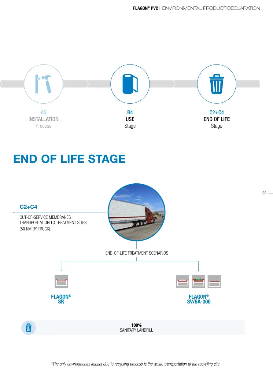 FLAGON® PVC | ENVIRONMENTAL PRODUCT DECLARATION23A5INSTALLATION ProcessB4USE StageC2+C4END OF LIFEStageEND OF LIFE STAGEC2+C4OUT-OF-SERVICE MEMBRANES TRANSPORTATION TO TREATMENT SITES (50 KM BY TRUCK)100% SANITARY LANDFILLFLAGON® SR*The only environmental impact due to recycling process is the waste transportation to the recycling siteEND-OF-LIFE TREATMENT SCENARIOSFLAGON®SV/SA-300