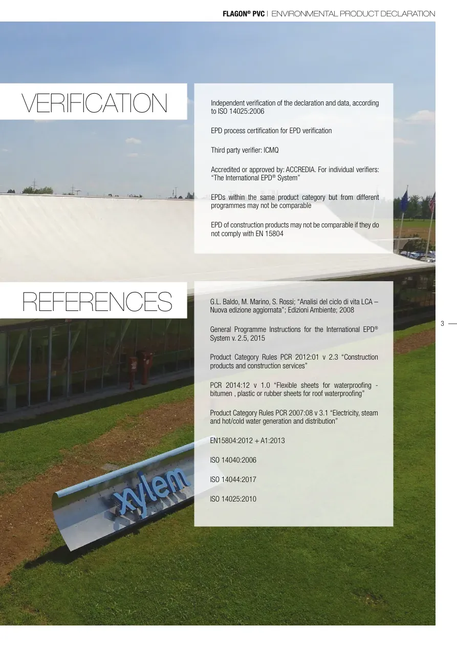 FLAGON® PVC | ENVIRONMENTAL PRODUCT DECLARATION3REFERENCES VERIFICATION G.L. Baldo, M. Marino, S. Rossi; “Analisi del ciclo di vita LCA – Nuova edizione aggiornata”; Edizioni Ambiente; 2008General Programme Instructions for the International EPD® System v. 2.5, 2015Product Category Rules PCR 2012:01 v 2.3 “Construction products and construction services”PCR 2014:12 v 1.0 “Flexible sheets for waterproofing - bitumen , plastic or rubber sheets for roof waterproofing”Product Category Rules PCR 2007:08 v 3.1 “Electricity, steam and hot/cold water generation and distribution”EN15804:2012 + A1:2013ISO 14040:2006ISO 14044:2017ISO 14025:2010Independent verification of the declaration and data, according to ISO 14025:2006 EPD process certification for EPD verification Third party verifier: ICMQAccredited or approved by: ACCREDIA. For individual verifiers: “The International EPD® System” EPDs within the same product category but from different programmes may not be comparableEPD of construction products may not be comparable if they do not comply with EN 15804