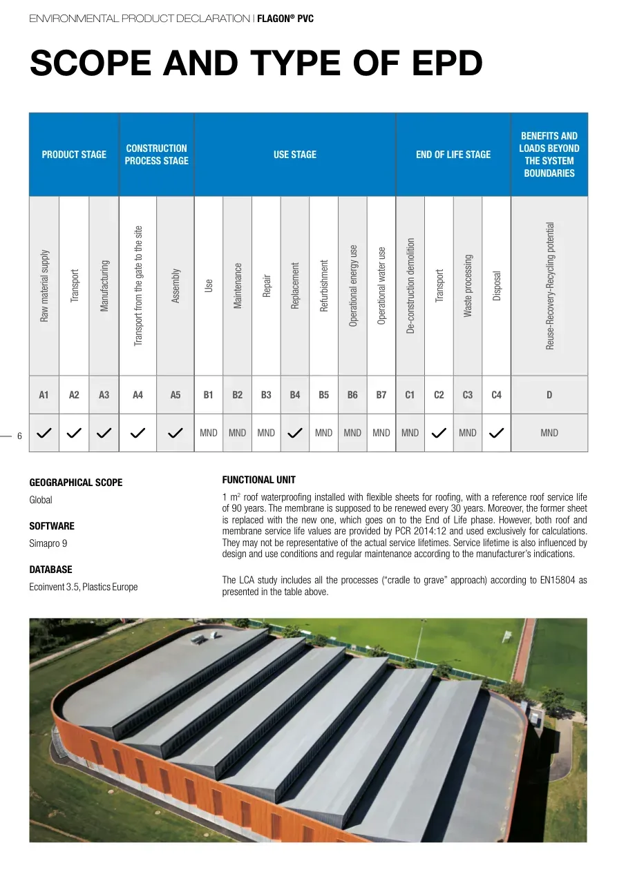ENVIRONMENTAL PRODUCT DECLARATION | FLAGON® PVC6SCOPE AND TYPE OF EPDPRODUCT STAGECONSTRUCTION PROCESS STAGEUSE STAGEEND OF LIFE STAGEBENEFITS AND LOADS BEYOND THE SYSTEM BOUNDARIESRaw material supplyTransportManufacturingTransport from the gate to the siteAssemblyUseMaintenanceRepairReplacementRefurbishmentOperational energy useOperational water useDe-construction demolitionTransportWaste processingDisposalReuse-Recovery-Recycling potentialA1A2A3A4A5B1B2B3B4B5B6B7C1C2C3C4DMNDMNDMNDMNDMNDMNDMNDMNDMNDGEOGRAPHICAL SCOPEGlobalSOFTWARESimapro 9DATABASEEcoinvent 3.5, Plastics EuropeFUNCTIONAL UNIT1 m2 roof waterproofing installed with flexible sheets for roofing, with a reference roof service life of 90 years. The membrane is supposed to be renewed every 30 years. Moreover, the former sheet is replaced with the new one, which goes on to the End of Life phase. However, both roof and membrane service life values are provided by PCR 2014:12 and used exclusively for calculations. They may not be representative of the actual service lifetimes. Service lifetime is also influenced by design and use conditions and regular maintenance according to the manufacturer’s indications.The LCA study includes all the processes (“cradle to grave” approach) according to EN15804 as presented in the table above.