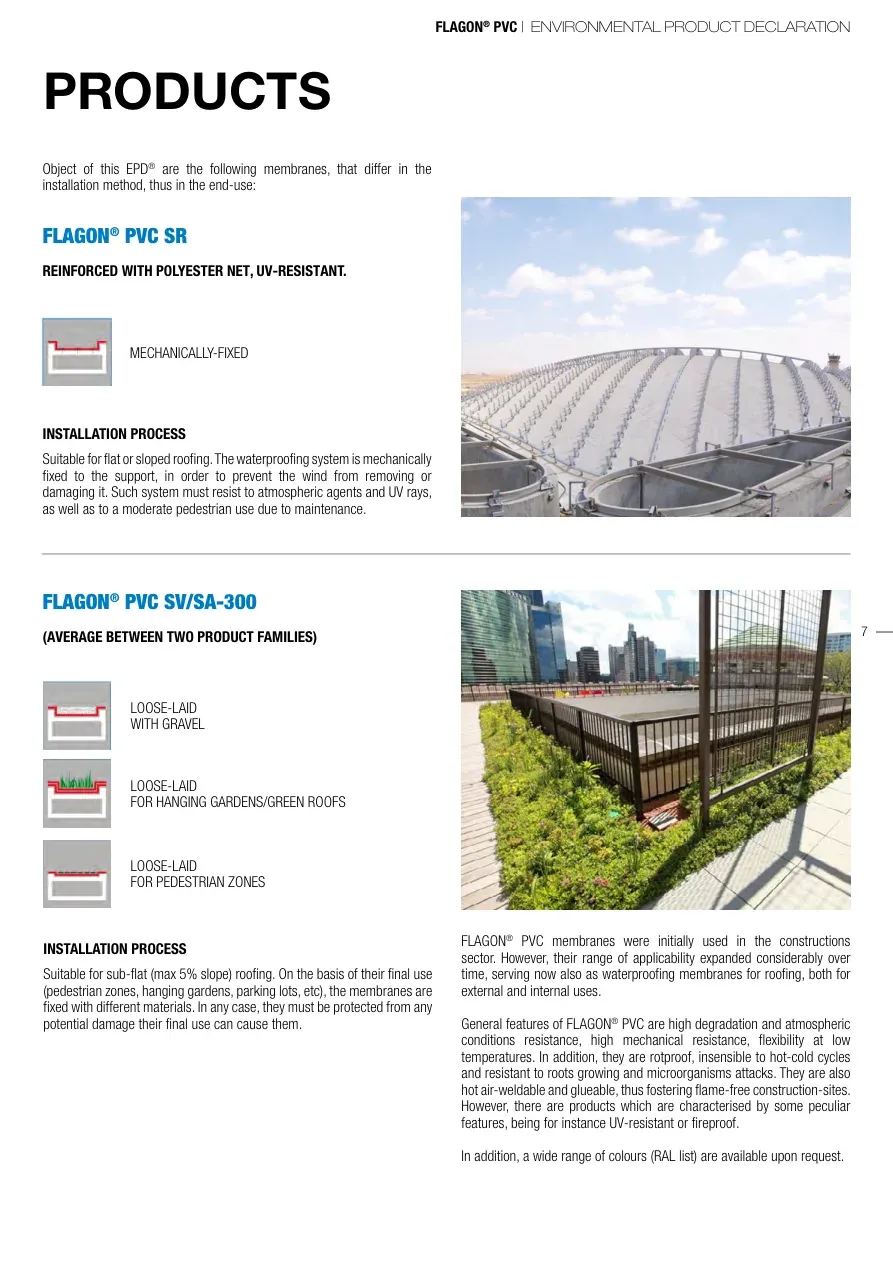 FLAGON® PVC | ENVIRONMENTAL PRODUCT DECLARATION7MECHANICALLY-FIXEDLOOSE-LAID WITH GRAVELLOOSE-LAIDFOR HANGING GARDENS/GREEN ROOFSLOOSE-LAID FOR PEDESTRIAN ZONESFLAGON® PVC membranes were initially used in the constructions sector. However, their range of applicability expanded considerably over time, serving now also as waterproofing membranes for roofing, both for external and internal uses.General features of FLAGON® PVC are high degradation and atmospheric conditions resistance, high mechanical resistance, flexibility at low temperatures. In addition, they are rotproof, insensible to hot-cold cycles and resistant to roots growing and microorganisms attacks. They are also hot air-weldable and glueable, thus fostering flame-free construction-sites.However, there are products which are characterised by some peculiar features, being for instance UV-resistant or fireproof.In addition, a wide range of colours (RAL list) are available upon request.FLAGON® PVC SV/SA-300 (AVERAGE BETWEEN TWO PRODUCT FAMILIES)INSTALLATION PROCESSSuitable for flat or sloped roofing. The waterproofing system is mechanically fixed to the support, in order to prevent the wind from removing or damaging it. Such system must resist to atmospheric agents and UV rays, as well as to a moderate pedestrian use due to maintenance.INSTALLATION PROCESSSuitable for sub-flat (max 5% slope) roofing. On the basis of their final use (pedestrian zones, hanging gardens, parking lots, etc), the membranes are fixed with different materials. In any case, they must be protected from any potential damage their final use can cause them.PRODUCTSObject of this EPD® are the following membranes, that differ in the installation method, thus in the end-use:FLAGON® PVC SRREINFORCED WITH POLYESTER NET, UV-RESISTANT.