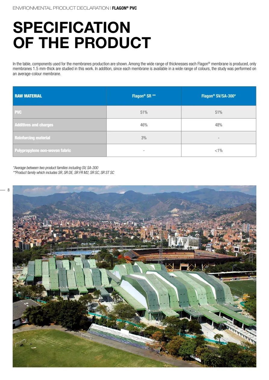 ENVIRONMENTAL PRODUCT DECLARATION | FLAGON® PVC8SPECIFICATIONOF THE PRODUCTRAW MATERIALFlagon® SR **Flagon® SV/SA-300*PVC51%51%Additives and charges46%48%Reinforcing material3%-Polypropylene non-woven fabric-<1%*Average between two product families including SV, SA-300**Product family which includes SR, SR DE, SR FR M2, SR SC, SR ST SCIn the table, components used for the membranes production are shown. Among the wide range of thicknesses each Flagon® membrane is produced, only membranes 1.5 mm-thick are studied in this work. In addition, since each membrane is available in a wide range of colours, the study was performed on an average-colour membrane.