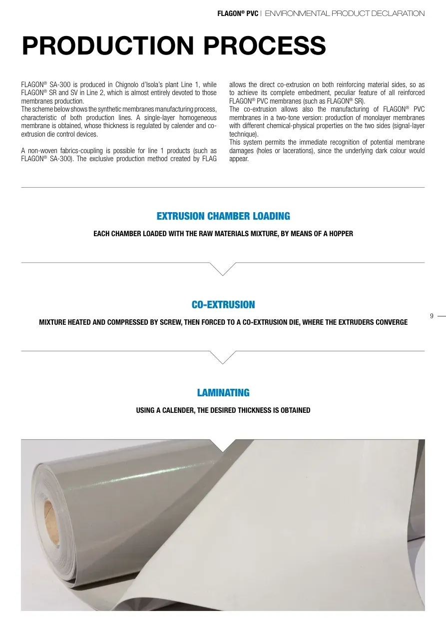 FLAGON® PVC | ENVIRONMENTAL PRODUCT DECLARATION9PRODUCTION PROCESSFLAGON® SA-300 is produced in Chignolo d’Isola’s plant Line 1, while FLAGON® SR and SV in Line 2, which is almost entirely devoted to those membranes production. The scheme below shows the synthetic membranes manufacturing process, characteristic of both production lines. A single-layer homogeneous membrane is obtained, whose thickness is regulated by calender and co-extrusion die control devices.A non-woven fabrics-coupling is possible for line 1 products (such as FLAGON® SA-300). The exclusive production method created by FLAG allows the direct co-extrusion on both reinforcing material sides, so as to achieve its complete embedment, peculiar feature of all reinforced FLAGON® PVC membranes (such as FLAGON® SR).The co-extrusion allows also the manufacturing of FLAGON® PVC membranes in a two-tone version: production of monolayer membranes with different chemical-physical properties on the two sides (signal-layer technique).This system permits the immediate recognition of potential membrane damages (holes or lacerations), since the underlying dark colour would appear.EXTRUSION CHAMBER LOADING EACH CHAMBER LOADED WITH THE RAW MATERIALS MIXTURE, BY MEANS OF A HOPPERCO-EXTRUSION MIXTURE HEATED AND COMPRESSED BY SCREW, THEN FORCED TO A CO-EXTRUSION DIE, WHERE THE EXTRUDERS CONVERGELAMINATING USING A CALENDER, THE DESIRED THICKNESS IS OBTAINED